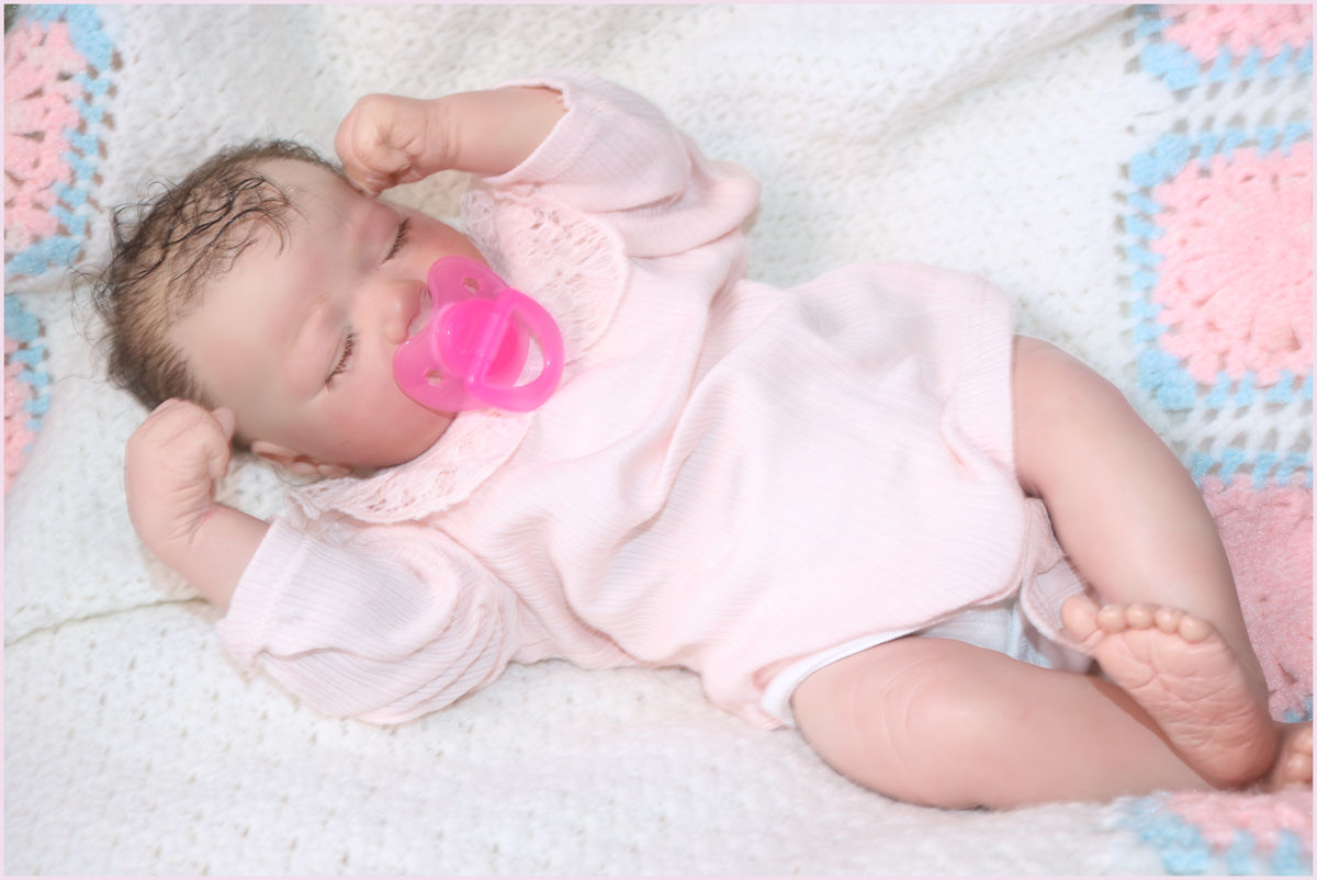 Welcome Miss Blakely Rose to the Brittany’s Babies Nursery. The finished baby is 18 inches and weighs 4 pounds and 8 ounces. She has full vinyl legs and arms and is on a cloth body. The baby has baby soft vinyl. She has been painted with the Irresistables Heat Set Paints. Every layer has been baked on. When shading and blushing the babies, I strive to make their coloring is as close to a real baby’s skin as it can be. Every little crease, wrinkles have been lovingly brought to life.